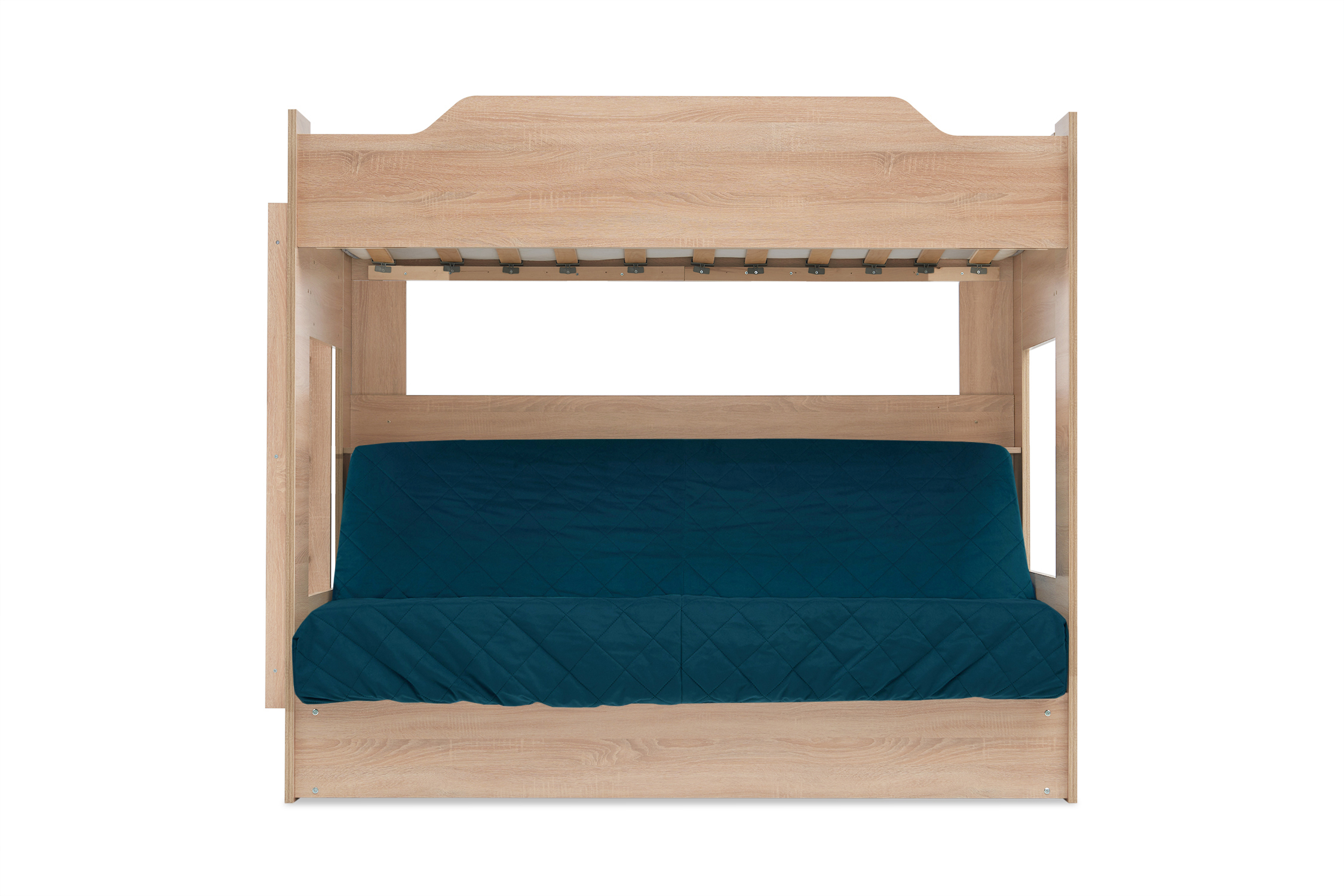 Механизм трансформации дивана: «Книжка». Рекомендуемая высота матраса на верхний ярус 17 см. Максимальная нагрузка на верхний ярус 50 кг. Лестница может быть установлена с обеих сторон кровати. Высота бортика 30 см. Максимальная нагрузка на нижний ярус 90 кг. Чехол съемный.