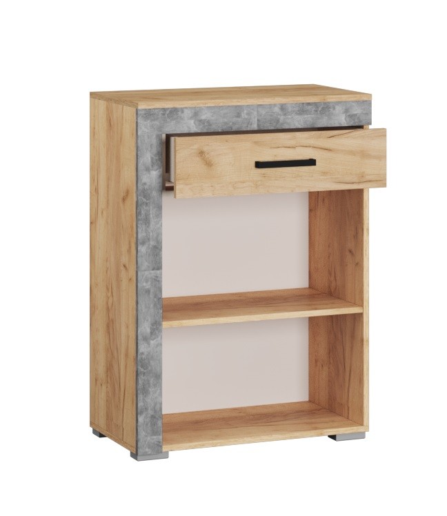 Ни одна прихожая не обходится без тумбы-обувницы. Высокая обувница из коллекции Галант - отличный вариант для современной входной зоны. Тумба имеет выкатной ящик и две распашные дверцы, за которыми скрывается полка. Вы с легкостью расположите коробки с уличной обувью, домашнюю обувь, а также мелкие аксессуары, которые необходимо иметь под рукой. Особенности декор дуб крафт золотой/ателье светлое стильная черная фурнитура геометрической формы разноплановое наполнение