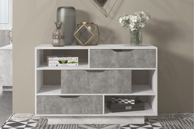 Особенности комода: Интересный дизайн. Контрастное цветовое исполнение. Сочетание открытых полок и выдвижных ящиков.